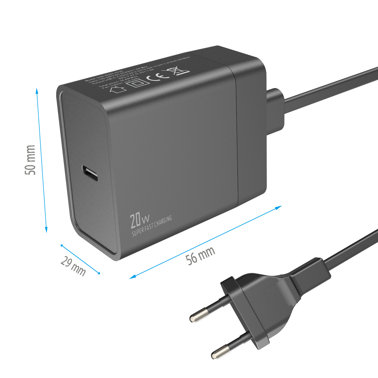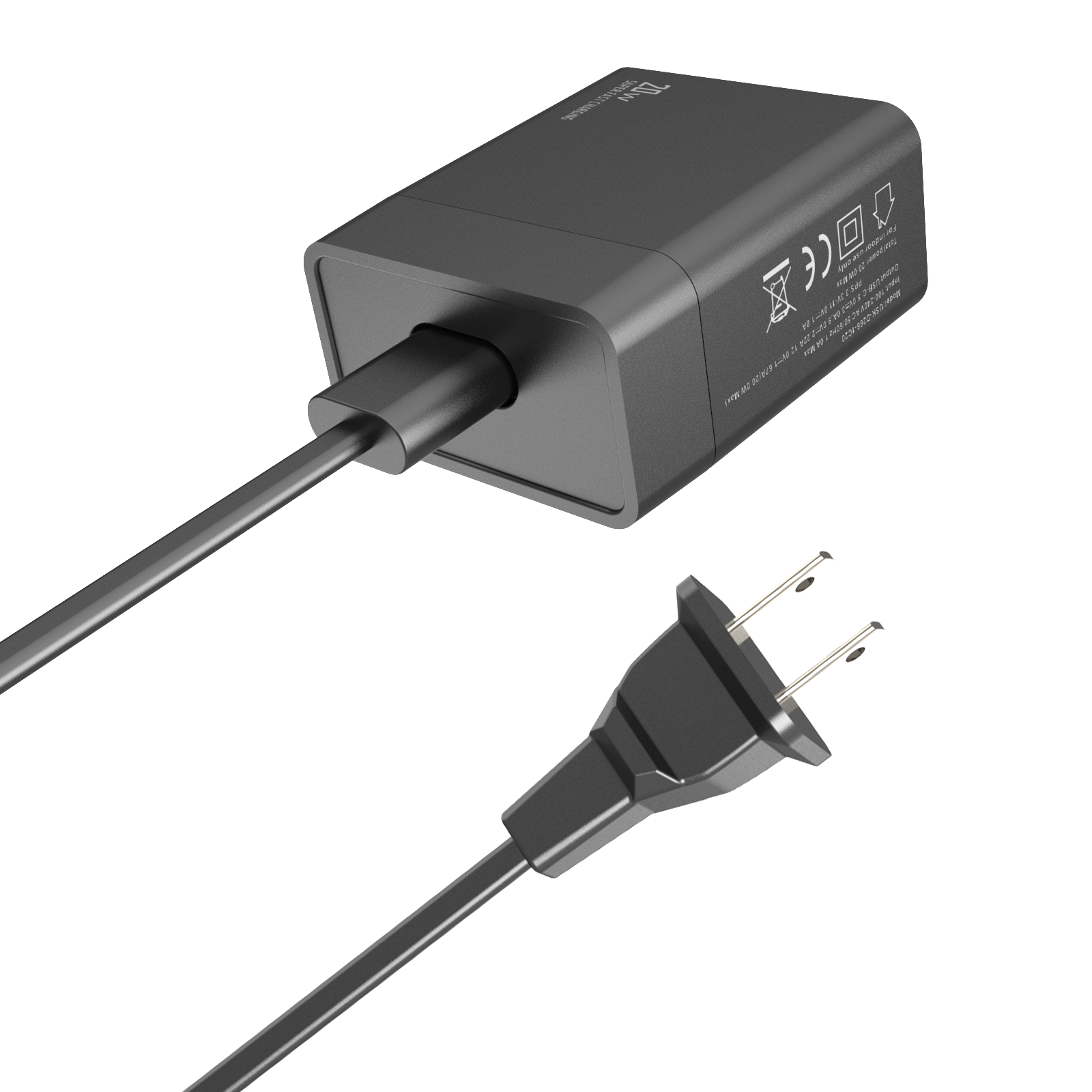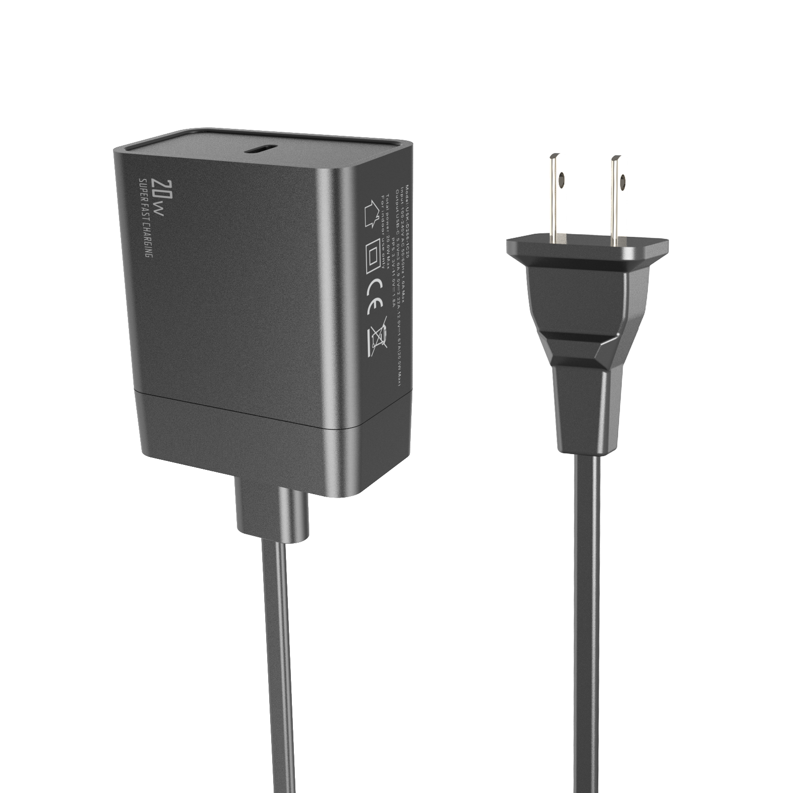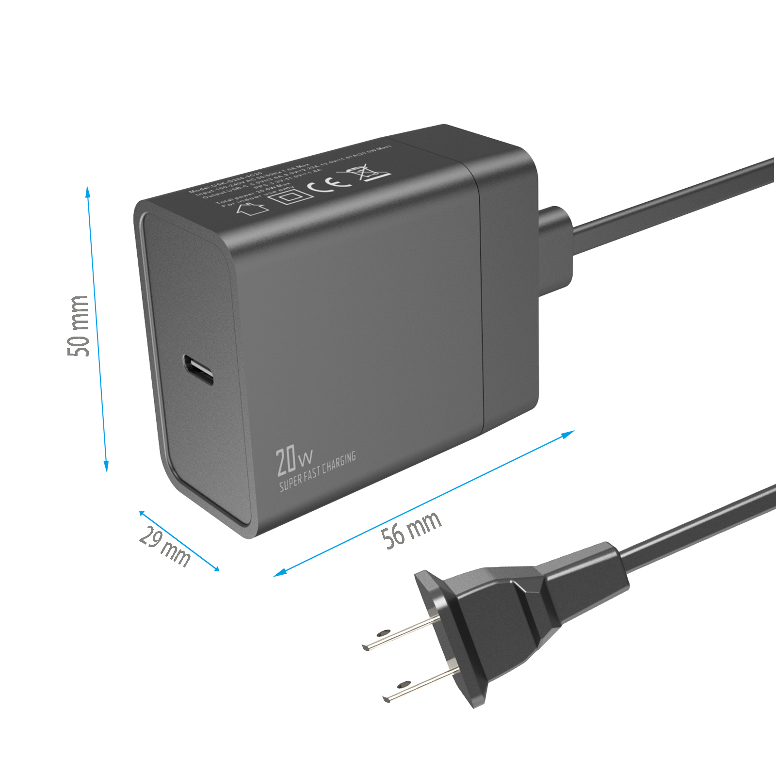 - Input:100-240V AC 50/60Hz 1.0A - Output:USB-CF:5V/3A,9V/2.22A,12V/1.67A, (max.20W)