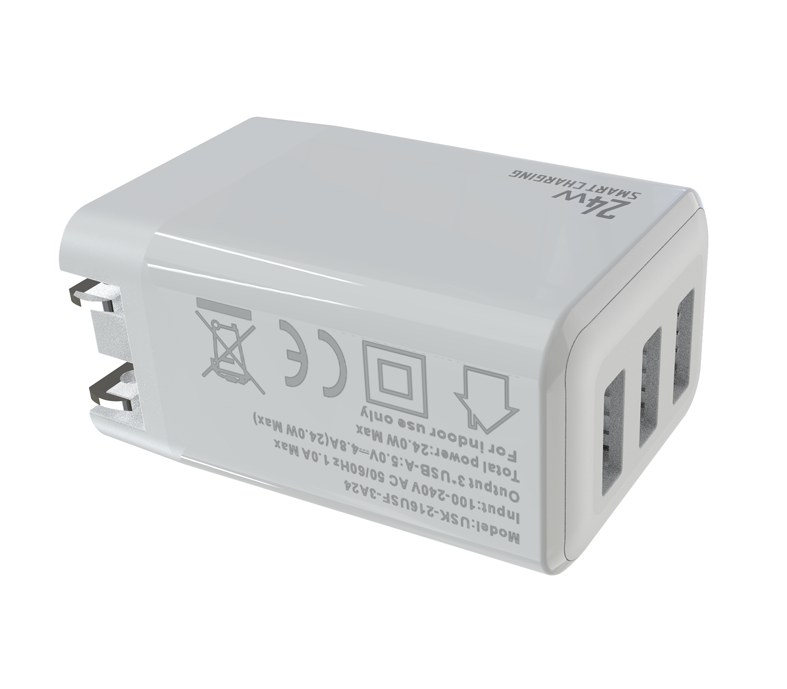 - Input:100-240V AC 50/60Hz 1.0A - Output:3*USB-AF:5V/4.8A(Each port max 2.0A)