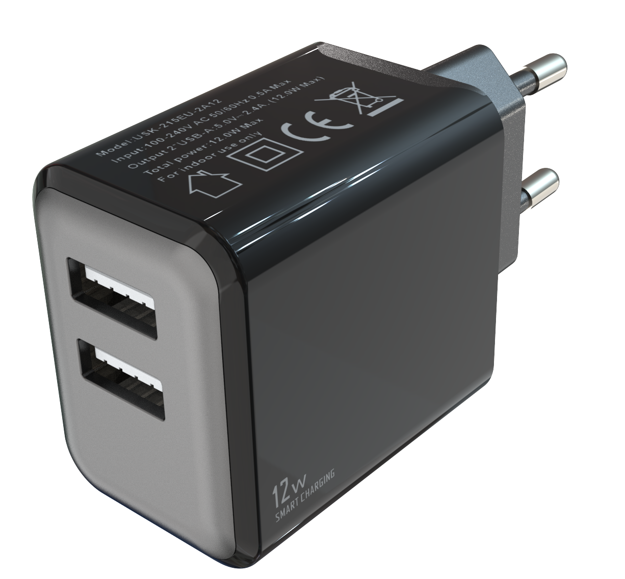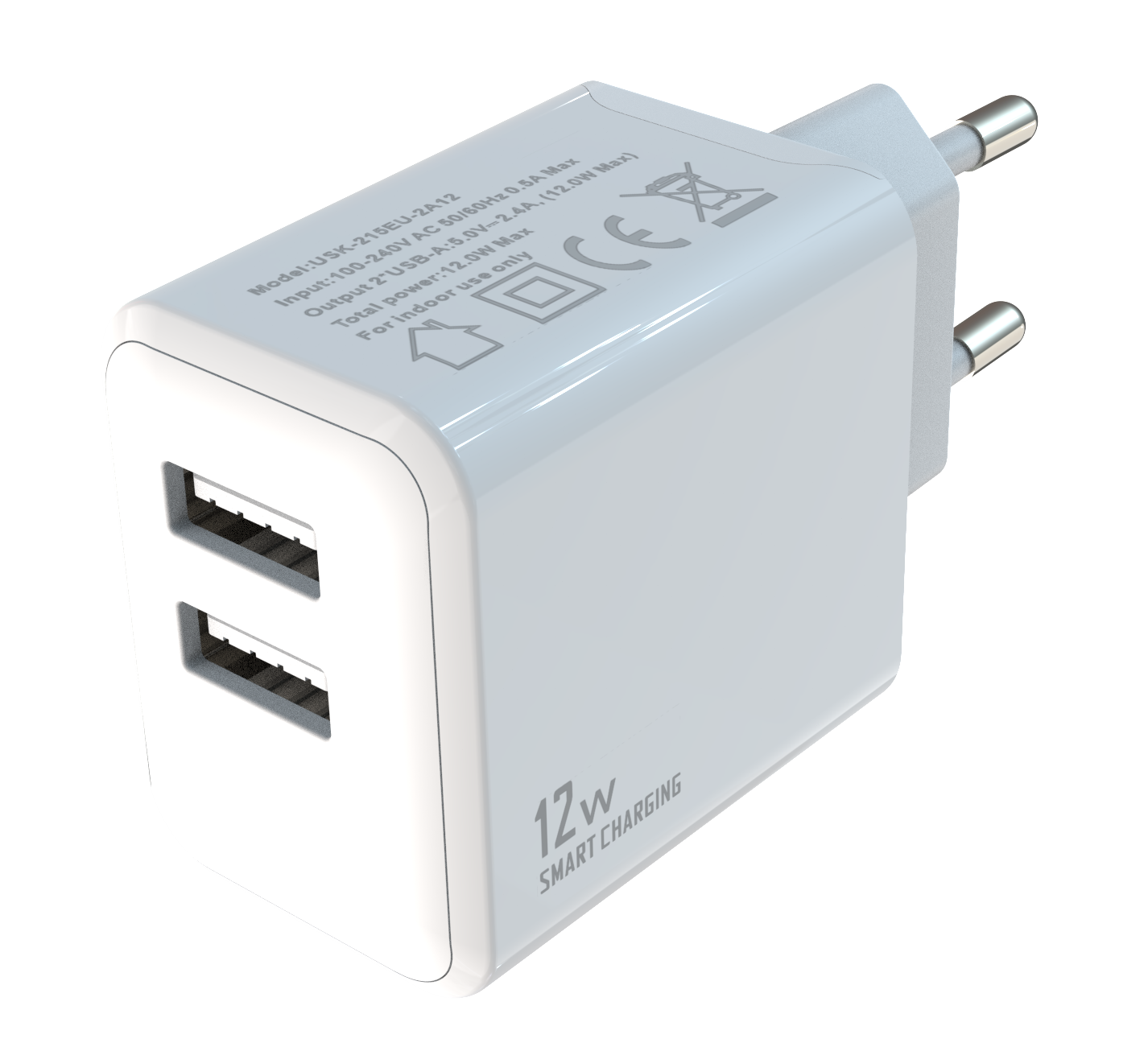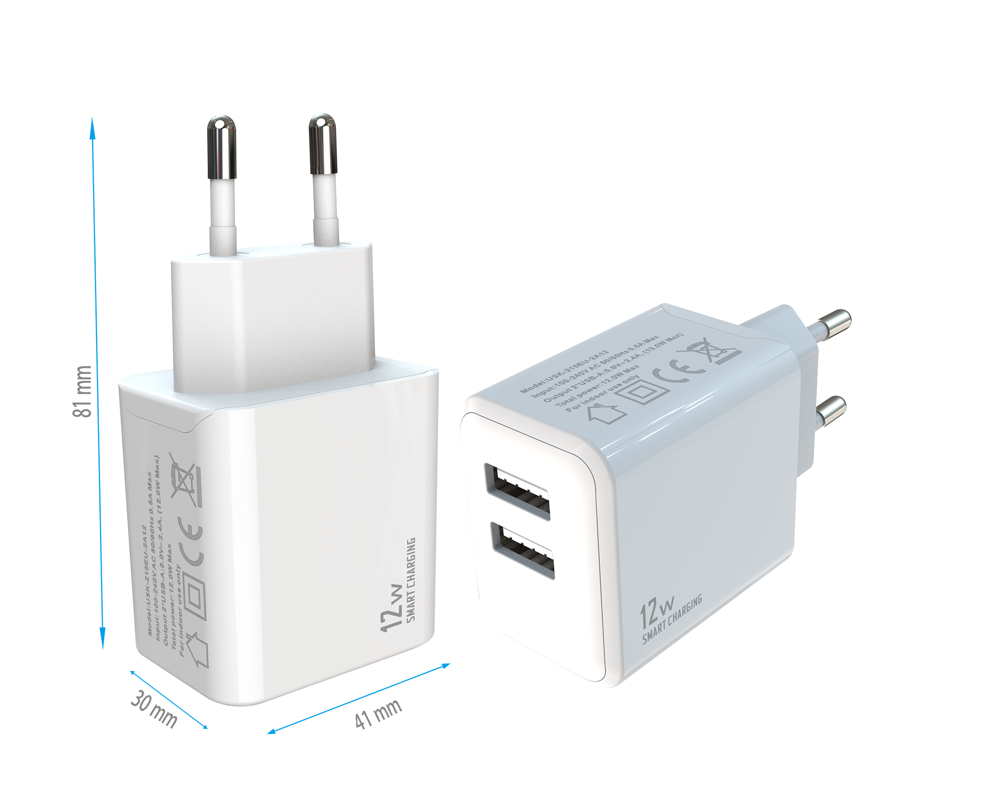 - Input:100-240V AC 50/60Hz 0.5A - Output:2*USB-AF:5V/2.4A (max.12W)