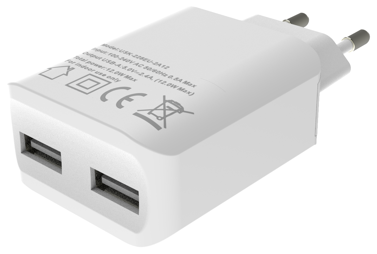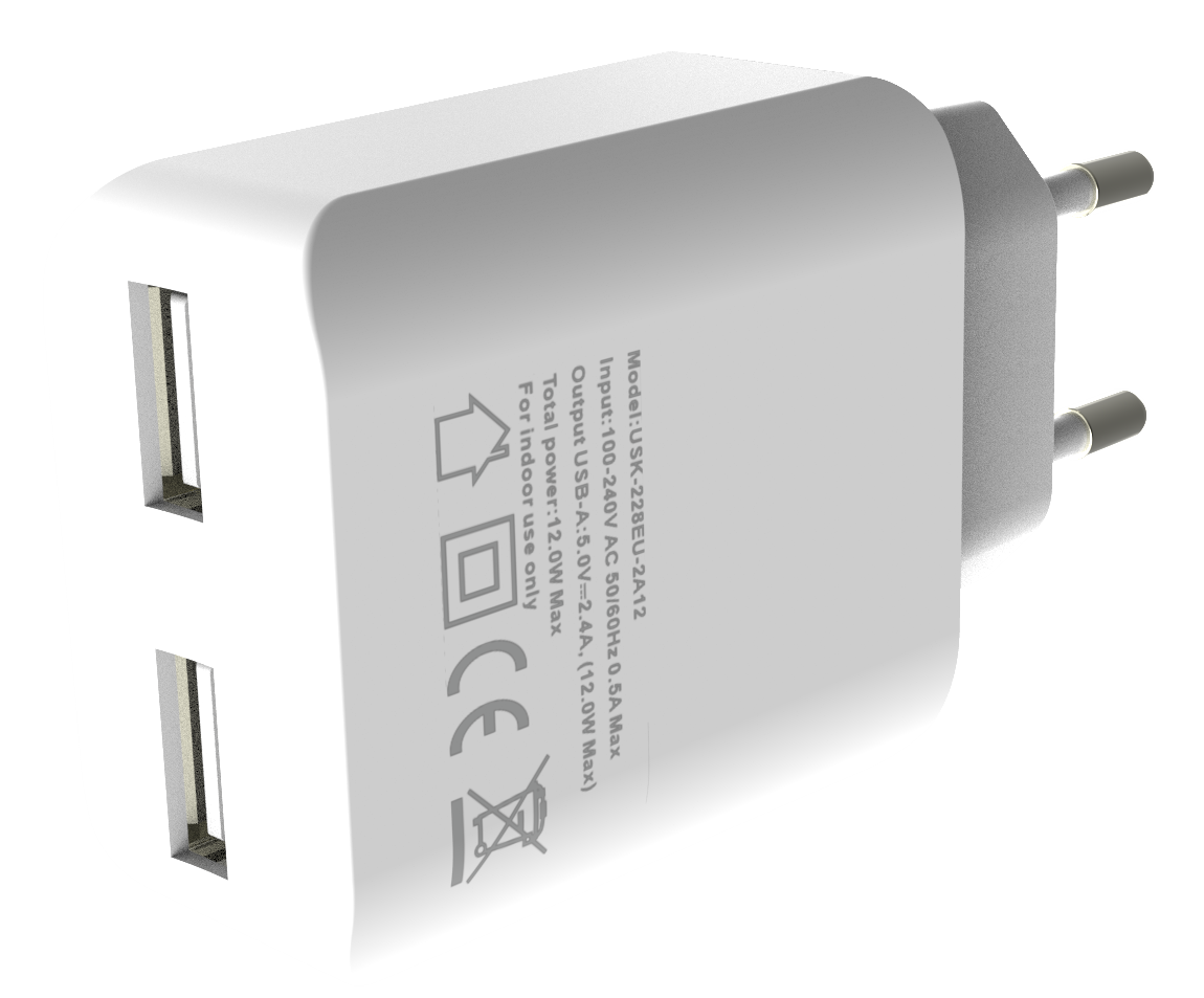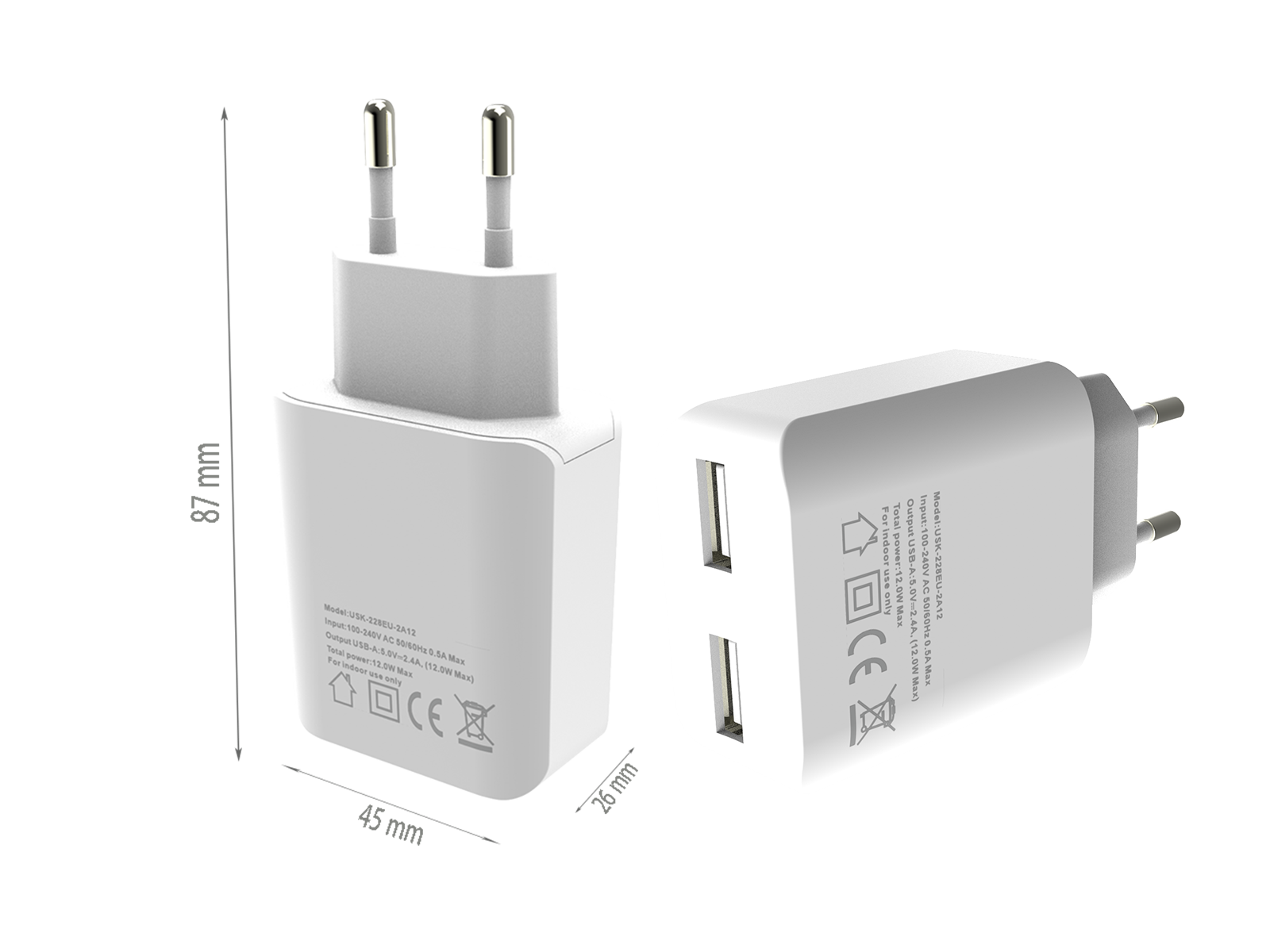 - Input:100-240V AC 50/60Hz 0.5A - Output:2*USB-AF:5V/2.4A (max.12W)