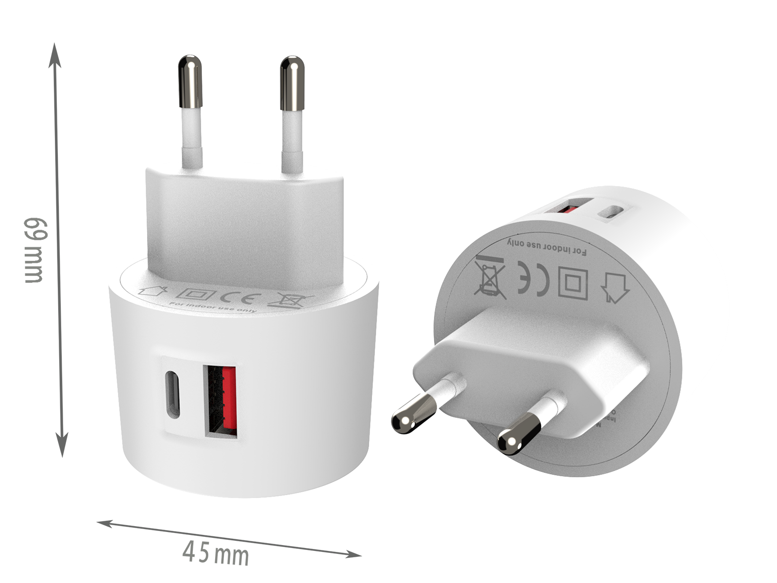 - Input:100-240V AC 50/60Hz 1.0A - Output:USB-CF:5V/3A,9V/2.22A,12V/1.67A, (max.20W) - USB-AF:5V/3A,9V/2A,12V/1.5A(max.18W)