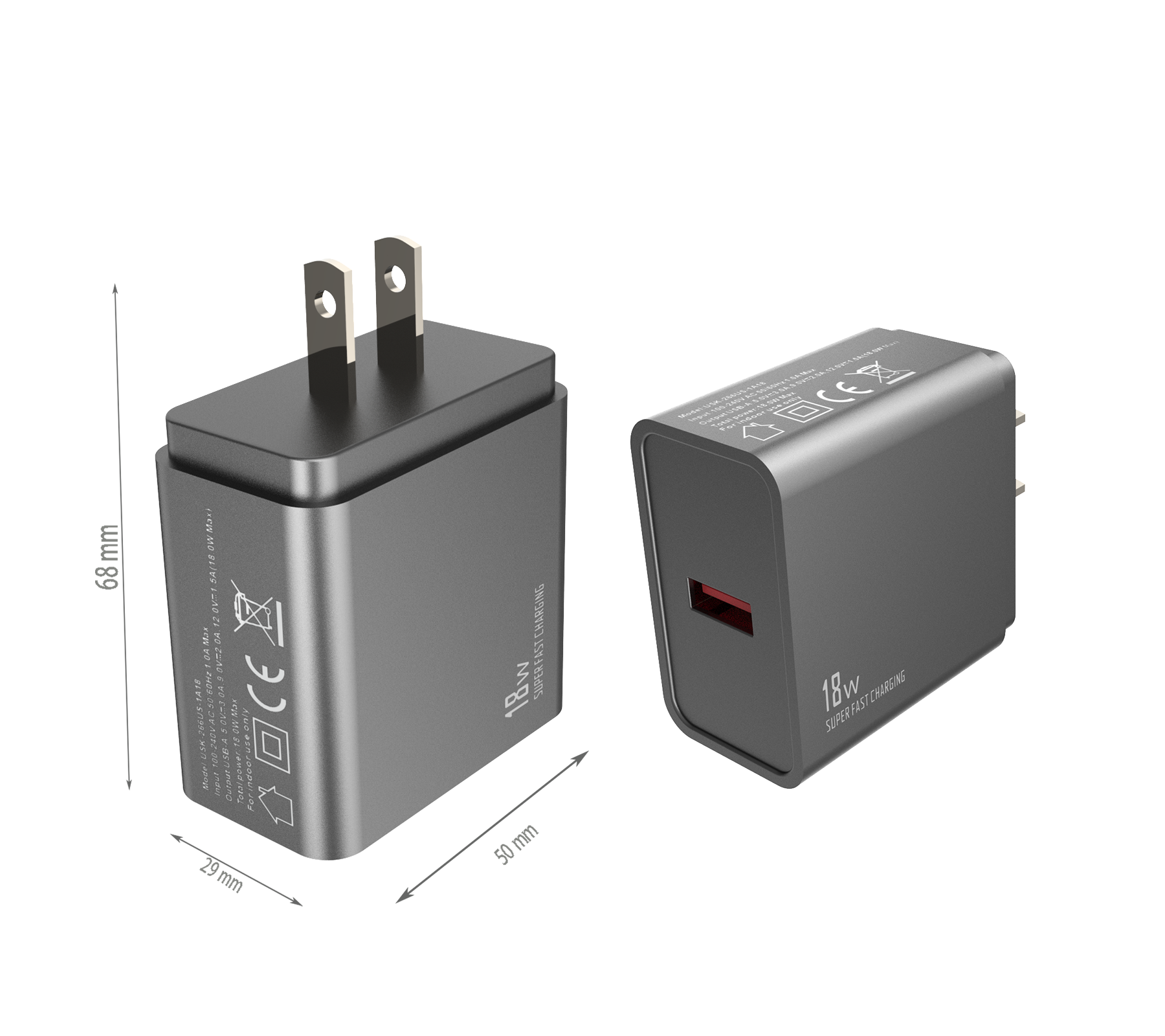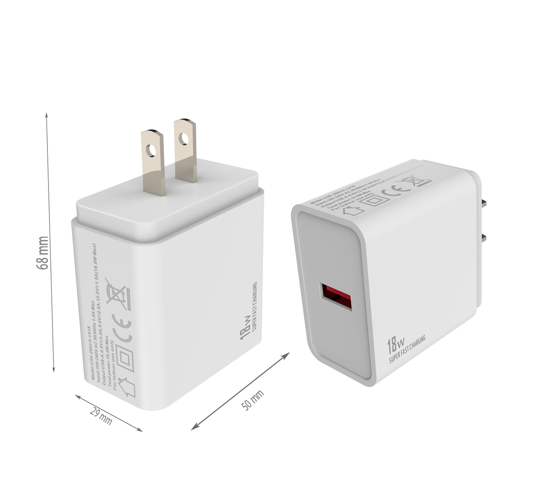 - Input:100-240V AC 50/60Hz 1.0A - Output:USB-AF:5V/3A,9V/2A,12V/1.5A (max.18W)